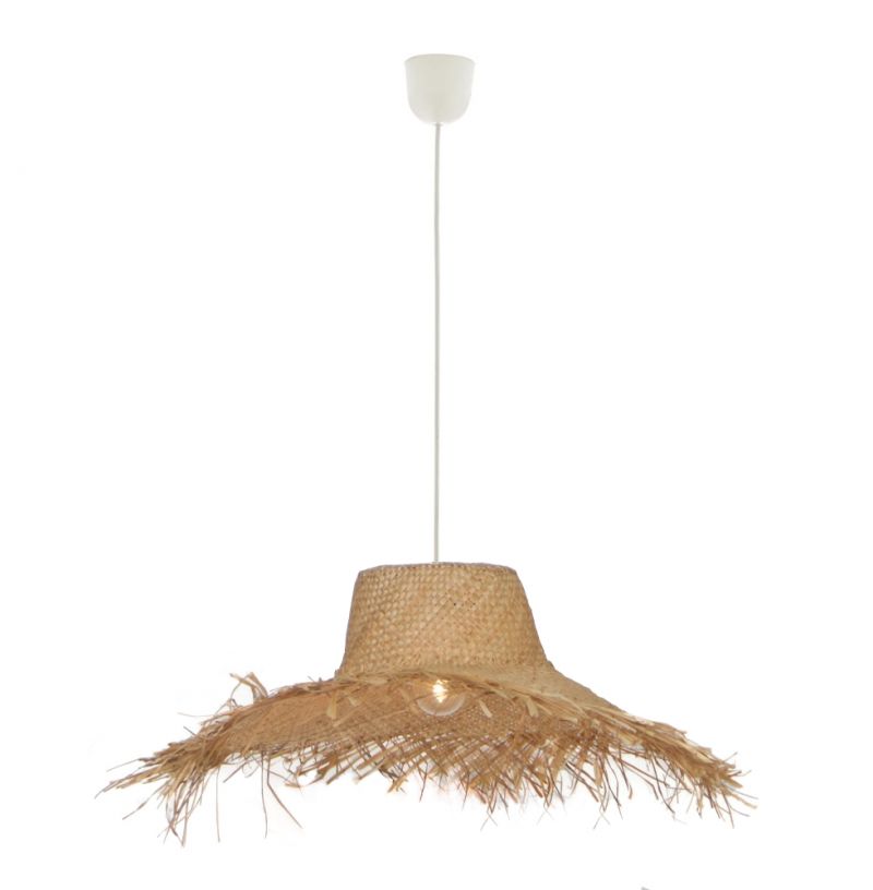 Κρεμαστό φωτιστικό οροφής με ψάθινο πλεκτό καπέλο σε φυσικό χρώμα και λευκή βάση οροφής.